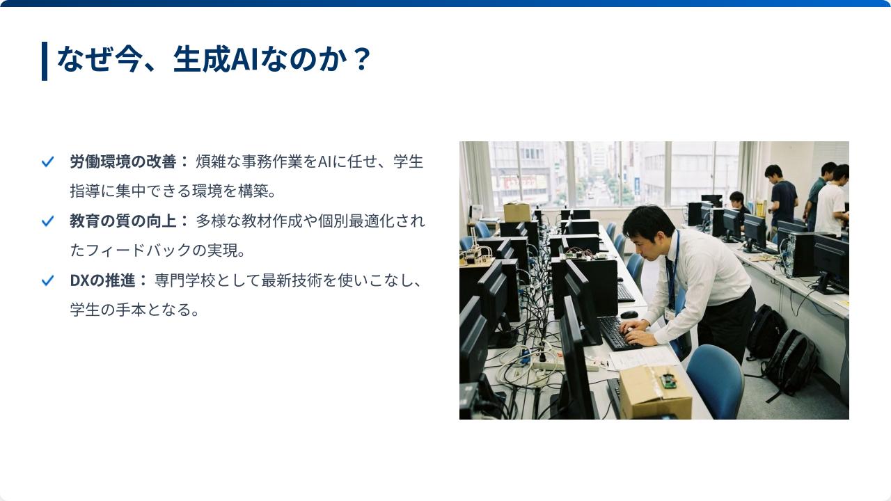 それは教育現場に限らず、企業内DXを含め、組織そのものの在り方を大きく変える可能性を秘めています。その変化にどう向き合うかが、企業や学校にとっての生き残り戦略につながっていくのではないでしょうか。