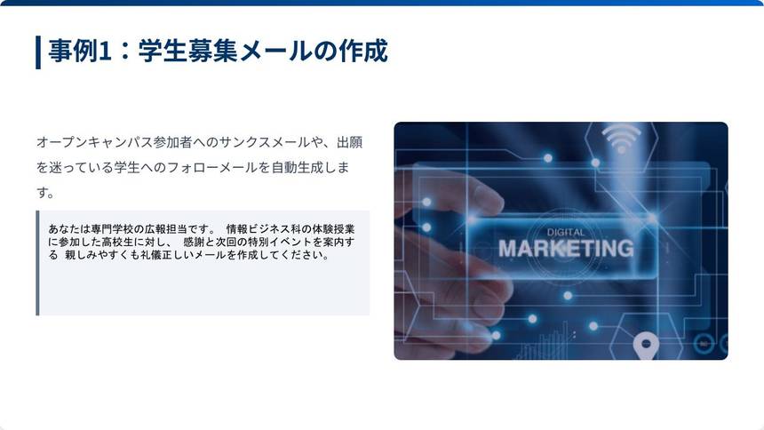 2時間にわたるレクチャー資料の一部ですが、これらを作る場合一旦対象となる学校の内容をAIに把握させ、その業務内容を元に、生成させる事で、より実体に近い講演内容とすることが可能です。