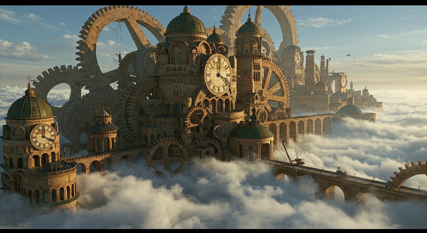 A forgotten city with clockwork buildings, where giant gears and cogs are part of the architecture. The city is half-submerged in a sea of clouds. Steampunk, surreal, highly detailed, wide-angle shot.