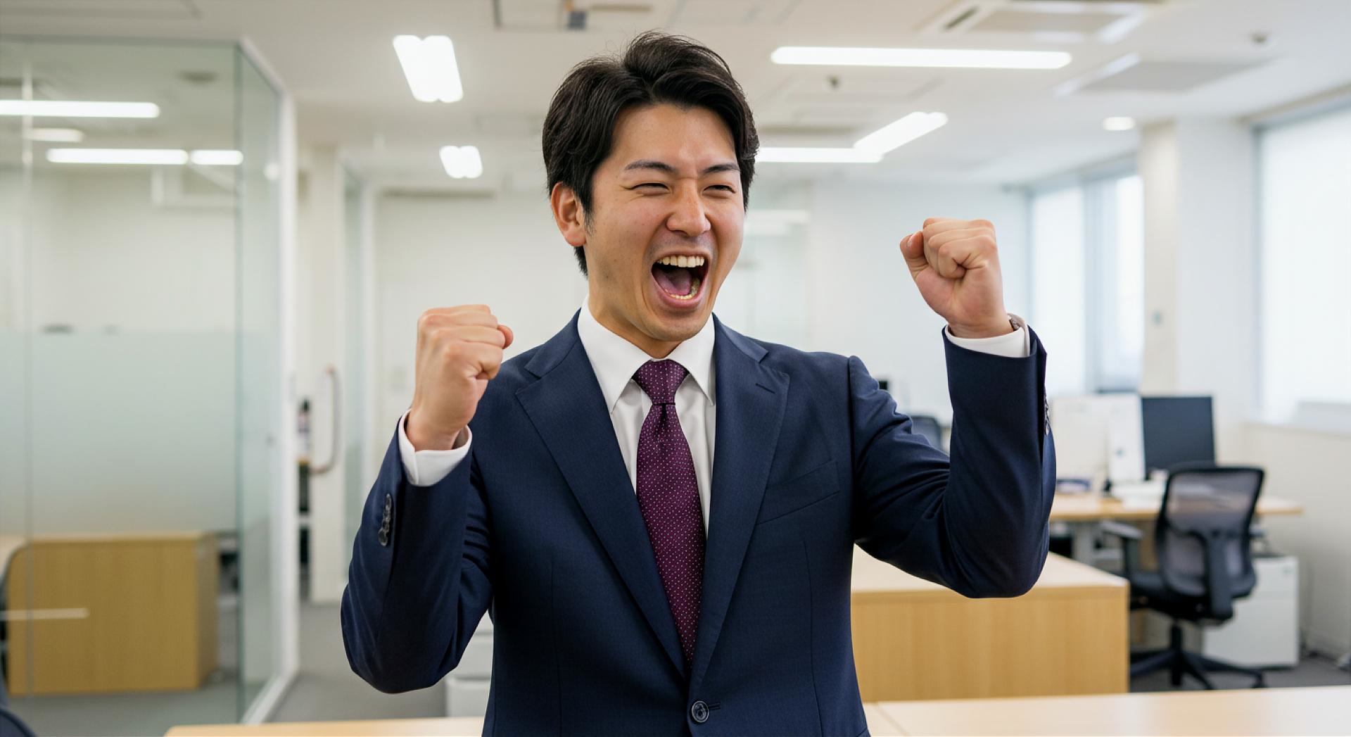 A photo of a Japanese businessman in a suit pumping his fist in the air, with a Japanese office in the background.