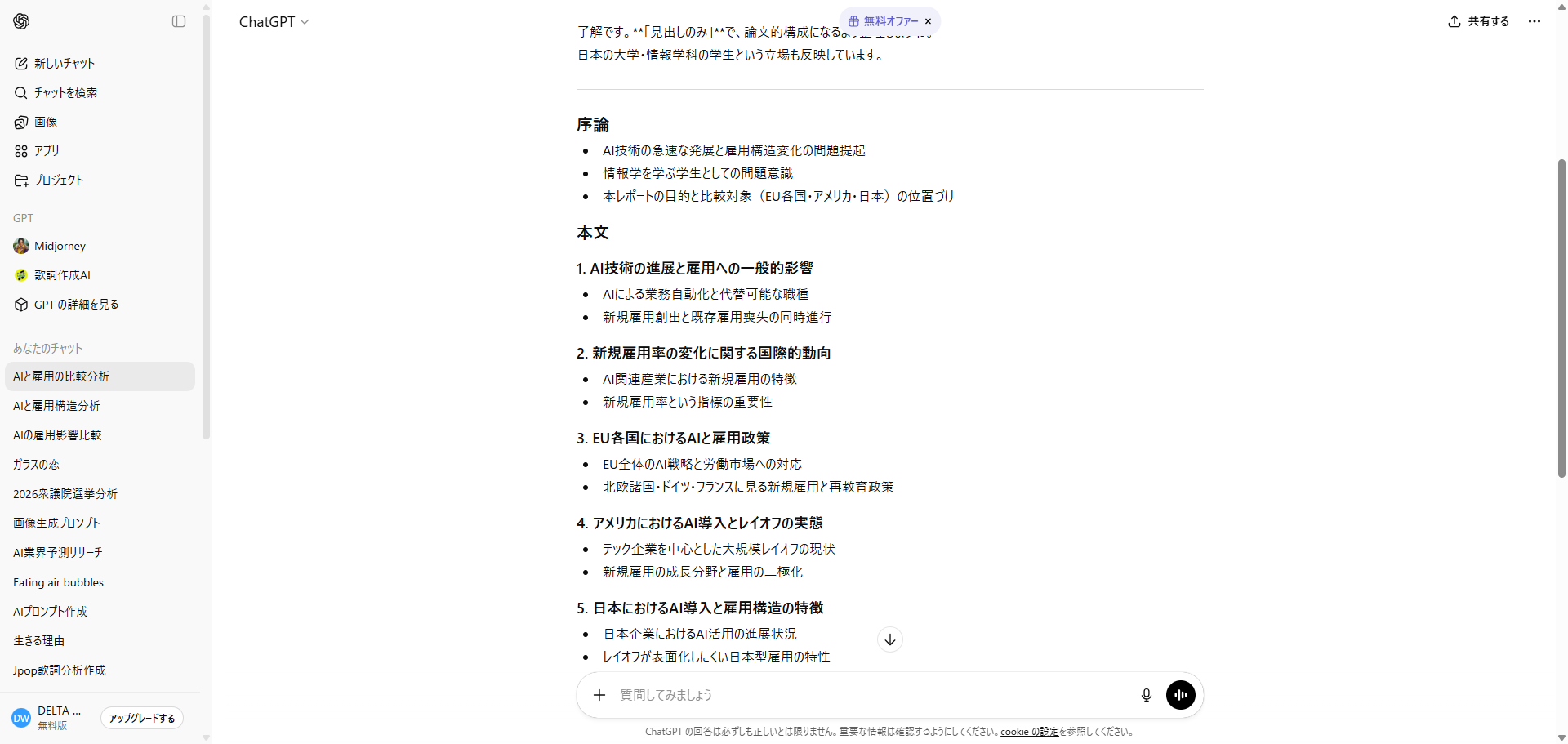 #内容:AIの影響と考えられる新規雇用率の変化及びレイオフの実態をEU各国及びアメリカと日本との比較(ここを改変)